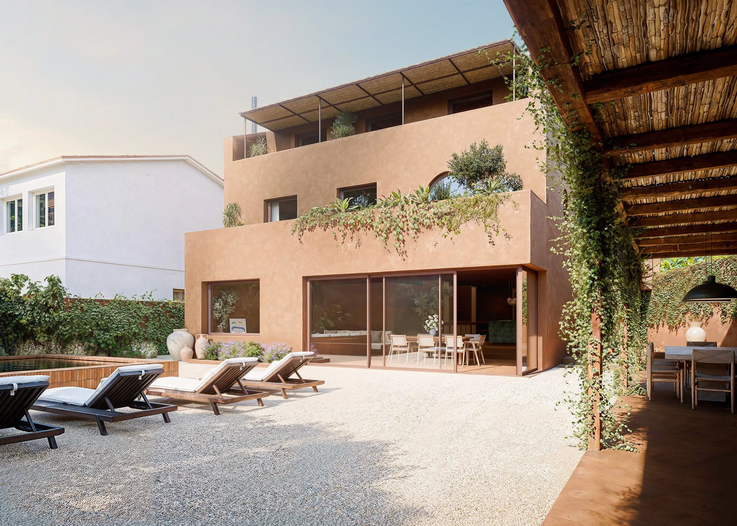 A sua materialidade cresce da própria terra. Tons de terracota, areia e argila atravessam exterior e interior numa continuidade silenciosa, inspirada em arribas fósseis, dunas antigas e no carácter telúrico do Alentejo. A paleta quente da paisagem cruza-se com uma frescura arquitectónica que equilibra o calor do verão, criando um refúgio que respira com o território e o enquadra.