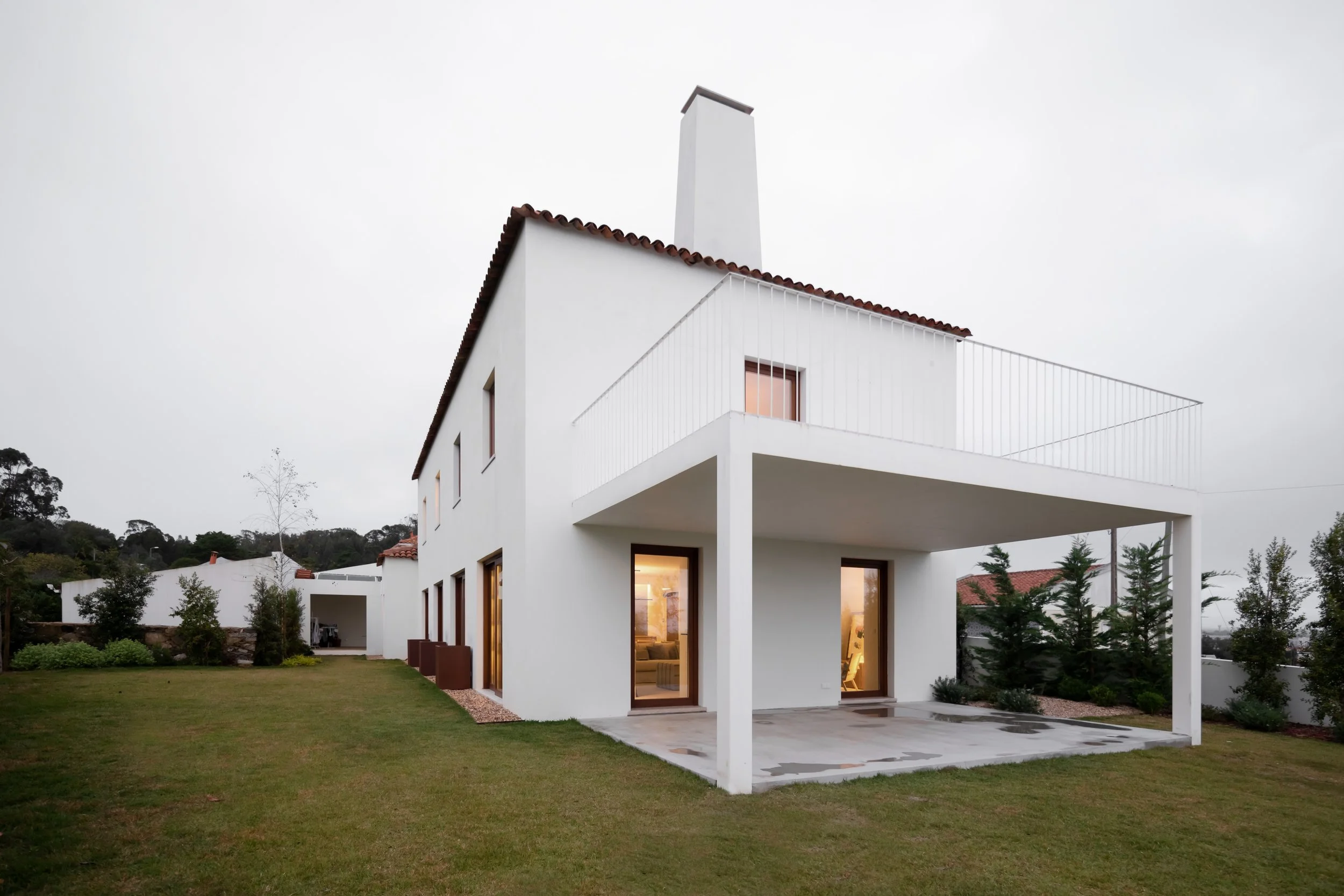 Located in Serra de Sintra, this house is naturally immersed in the mystical atmosphere that characterises this area. The contrast between the white walls and the green of the surrounding nature, affirms Ranholas’ House in the landscape. The smoothed concrete on the pavement also highlights the white plaster.
